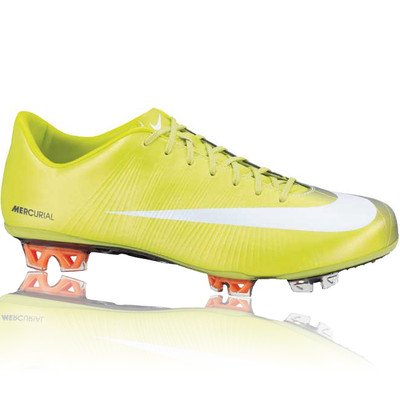 Nike Mercurial Vapor Superfly Firm Ground Football Boots. The Mercurial Vapor Superfly is the first football boot to incorporate Flywire technology and is the lightest football boot Nike's ever put on the pitch, weighing just 190 grams. Nike Flywire technology reduces the amount of material required to support the upper to the bare minimum without compromising the boots durability or integrity and support. Due to constant testing and rigorous questions directed at some of the top players in the world, including Cristiano Ronaldo, Pato, Zlatan Ibrahimovic and Robinho, Nike was able to pinpoint exactly where these structural elements needed to be placed to give the best support possible when playing the game.The upper is also unique in that it is designed to adapt to the motion of the foot, making it superbly flexible and supple which is very important if you are a player that relies on you speed and quick turning. Flywire Technology - is strategically placed filaments that provide optimal support and comfort precisely where the foot needs it but still making the boot extremely lightweight. 7-layer carbon composite outsole - lowers weight with maximum strength and flexibility where you need it the most. Soft, supple Teijin synthetic leather - reduces weight and optimises feeling with the ball making for a very comfortable and lightweight boot. Special coating at upper lateral boot - with contrast-colour identifies zone for best ball control and improves grip if you are a skillfull player who needs and likes to dribble with the ball. Superlight, superstrong direct-injected dual-density heel studs - for reduced weight with multi-directional pattern for excellent grip on hard surfaces. This really is a revolutionary football boot that is loved by some of the world's top players. It is extremely lightweight, comfortable and grippy meaning that if you want to step up your game to the next level than these boots are sure to help you. Read more...